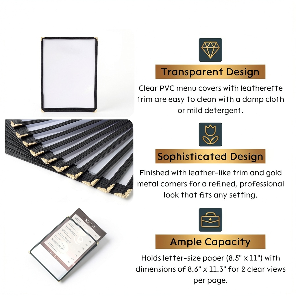 AMGSH clear PVC menu covers are designed for durability and ease of use in high-traffic environments. Made from flexible, non-toxic PVC, these covers feature a slide-in mechanism that allows for quick menu updates and a laminated surface for effortless cleaning with a cloth. They come in sizes accommodating 1 to 4 pages, with dimensions of 8.5 x 11 inches, and include double-stitched leather binding and golden corner protectors to safeguard menus from wear and tear. The product weighs 1.32 pounds and has package dimensions of 14.29 x 10.63 x 1.14 inches, ensuring sturdy protection during transport and daily use.